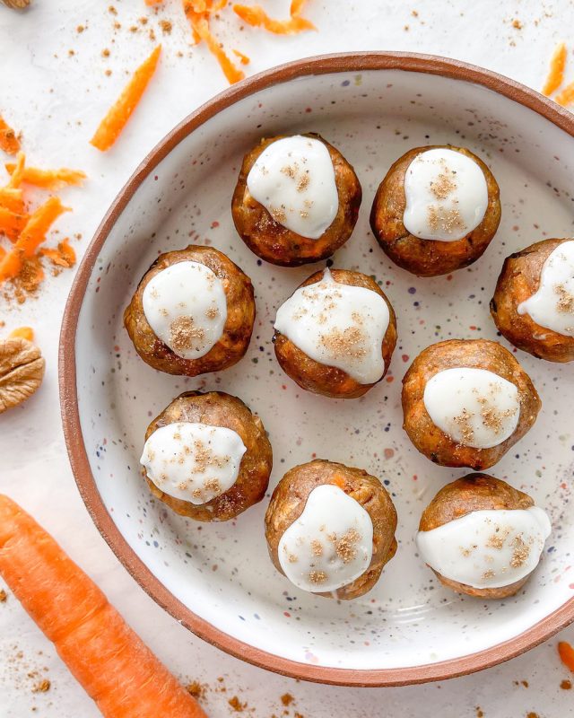 If you’re big carrot cake fan, I recommend you make these bites first, then try my Healthy Carrot Cake Latte. And even if you’re not a big fan of carrot cake (or have friends or family that are carrot cake haters), I still recommend you try these bites. I bet they’ll surprise you (and your friends and fam’).