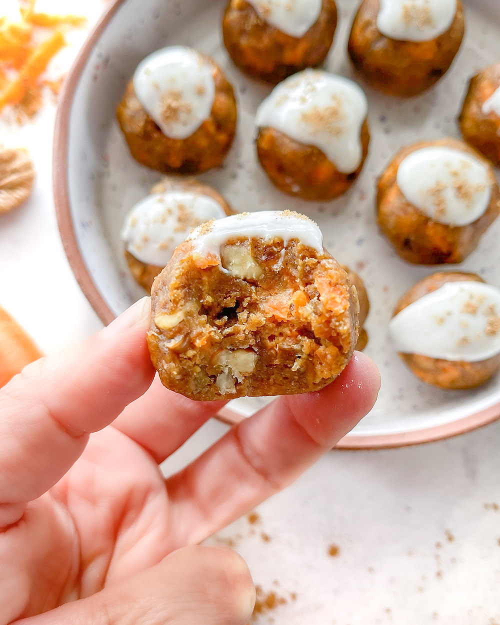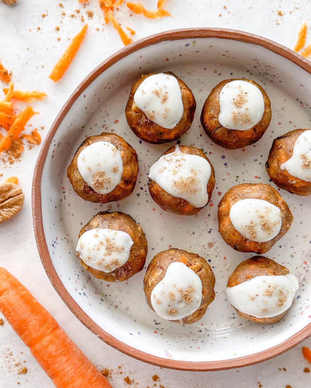 Okay obviously, yes, you can eat these Healthy Carrot Cake Bites plain without any icing, but why would you do that when you could top them with healthy cream cheese icing?! The “icing” is actually just a mixture of unsweetened vanilla yogurt of choice with powdered sugar stirred in to taste (I did it right in the yogurt container because I will always, ALWAYS make a task slightly harder and more annoying to avoid washing even one more dish). Pick a dairy-free yogurt to make the entire recipe dairy-free and vegan, or don’t—chef’s choice, per usual.