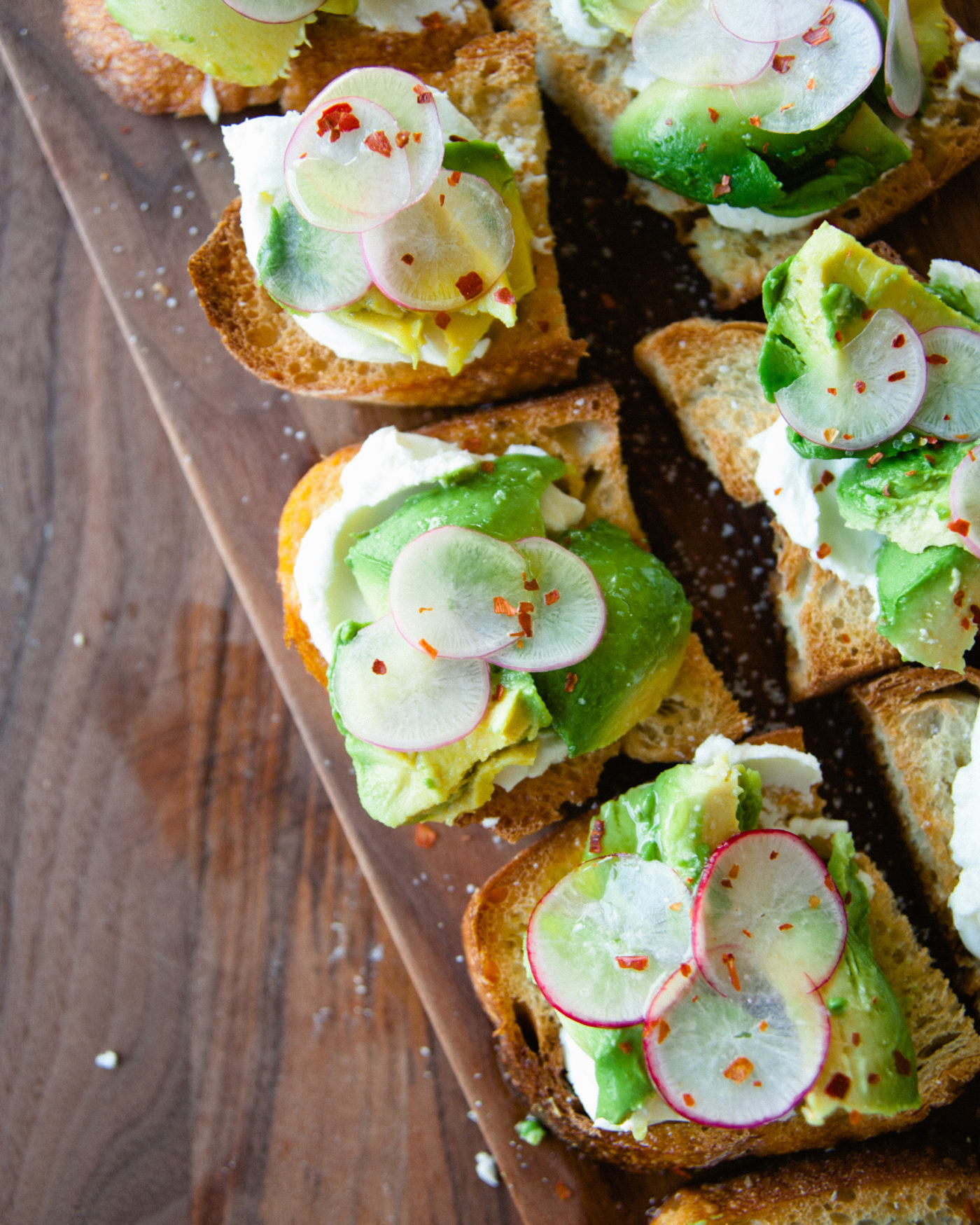 - Spread mascarpone on each slice of toast. Top with sliced avocado, radish slices, and garnish with lemon, chili, and olive oil.