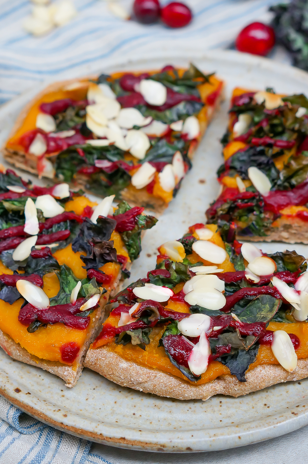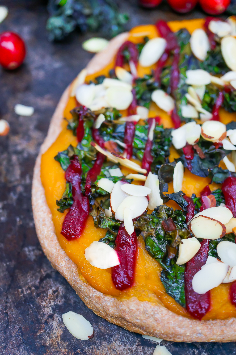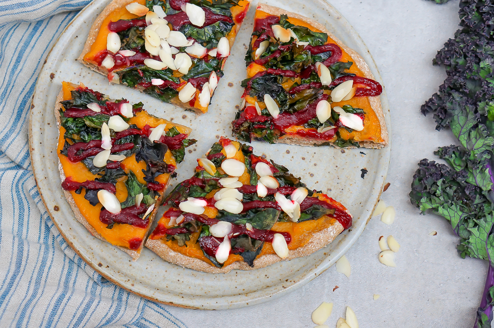 - To assemble pizza, prebake whatever pizza dough recipe you’re using for 5 minutes, then remove from oven. Top with a thin layer of butternut squash sauce, then top with kale, a drizzle of cranberry sauce and a generous sprinkle of almonds. Return to oven for 5 more minutes, or until kale is crispy at the edges and almonds are just beginning to turn golden brown. Makes enough toppings for 4 personal sized pizzas.
