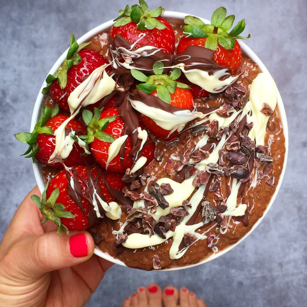 - To serve, top with strawberries, cacao nibs and even a drizzle of chocolate syrup (my favorite healthy recipe is here if you’re feeling decadent! Serves 1, although you can double or triple the recipe and eat it throughout the week.