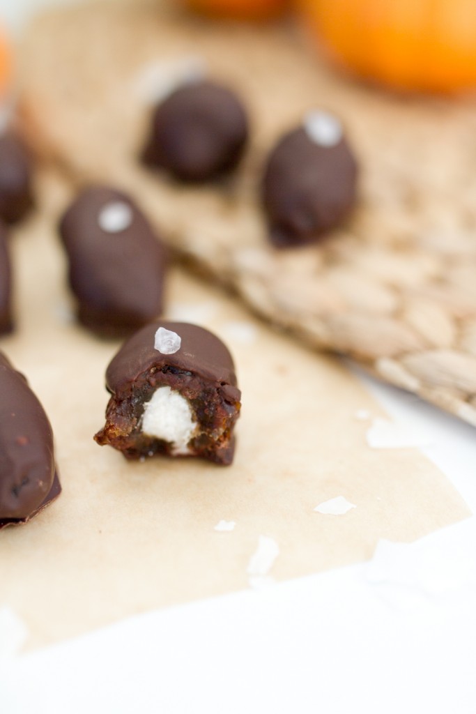 Although I’ve never met Liz in person, I can tell from her vibe that we’d be instant friends and I’m thrilled to be partnering up with her today to share some healthy Halloween treats. Anything with coconut and chocolate is my jam so I decided to make a DIY version of the Mounds bar. The recipe was inspired by a chocolate covered peanut butter stuffed date I had while at the Medjool Summit last month. As it turns outs, when Medjool dates are stuffed with coconut butter and covered with chocolate they taste and look amazingly similar to a Fun Size Mounds bar and make for an incredible treat. Enjoy!”