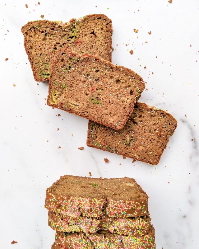 I know you all are obsessed with my healthy salted cookie dough banana bread, and for good reason—it’s SO delish! But this recipe might just take the, erm, cake. I’m here to welcome you to another healthy banana bread to swoon over, and, spoiler alert, she’s got big party energy.