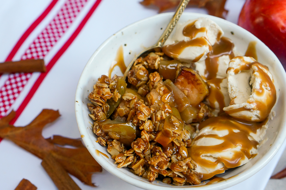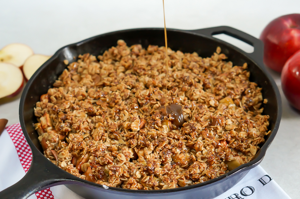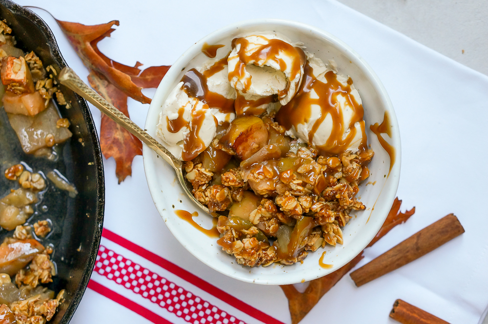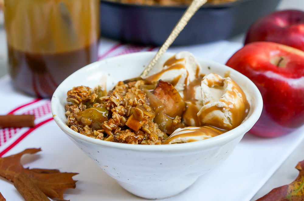 You can use any types of apples here – I used a variety that I gathered while apple picking last weekend. Tossed with cinnamon, they take on the flavors of fall, and have just the right amount of give underneath the oat and almond meal crisp (which, to be honest, I’ve been known to take more than my fair share of). The caramel drizzle on top brings the whole thing to life, elevating this from a delicious dessert to a show stopper worthy of any dinner party.