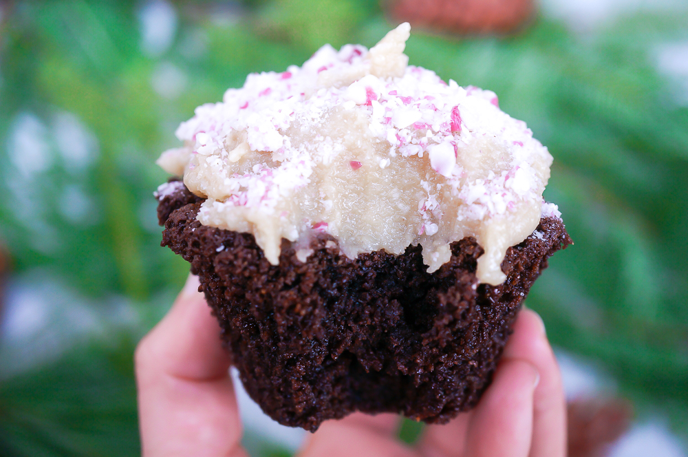 And the frosting – ohmysweettastebuds, the frosting. You can make the frosting two ways – if you want them to be completely healthy and refined sugar free, with a honey peppermint blend that tastes like the creamiest candy cane you’ve ever had. Or, if you’re feeling a bit more playful, you can simply blend the soaked cashews with a few crushed candy canes. Are candy canes something I eat on a regular basis? Nope. Are they perfectly healthy? No one’s arguing that. But they’re fun and they’re playful, and, if you get the ones at Whole Foods that are free of the artificial colors and flavors, they’re not that bad for you. These are packed with protein – more than most breakfasts, even – fiber and good fats. You can eat two or three and stay guilt free (although, realistically, if you’re gonna indulge in treats it should always be without guilt, because otherwise you’re not really treating yourself, are you?).