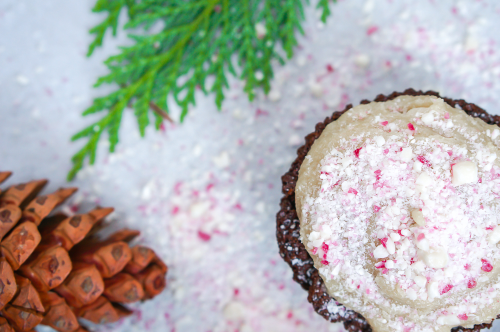 - Submerged the raw cashews completely in water, and soak for 1 – 2 hours. Place the candy canes into a food processor and process until a fine powder forms; scoop out a few heaping teaspoons (this is the snow dust) and set aside. Drain the cashews and add to the food processor. Process for 3 – 4 minutes – you don’t simply want the ingredients to combine, but you want the nuts to release their oils and for the texture to get very creamy. Spoon into a piping bag or a sandwich bag with the corner snipped off and pipe in a swirled shape on top of cupcakes. Dust with candy cane snow and serve.