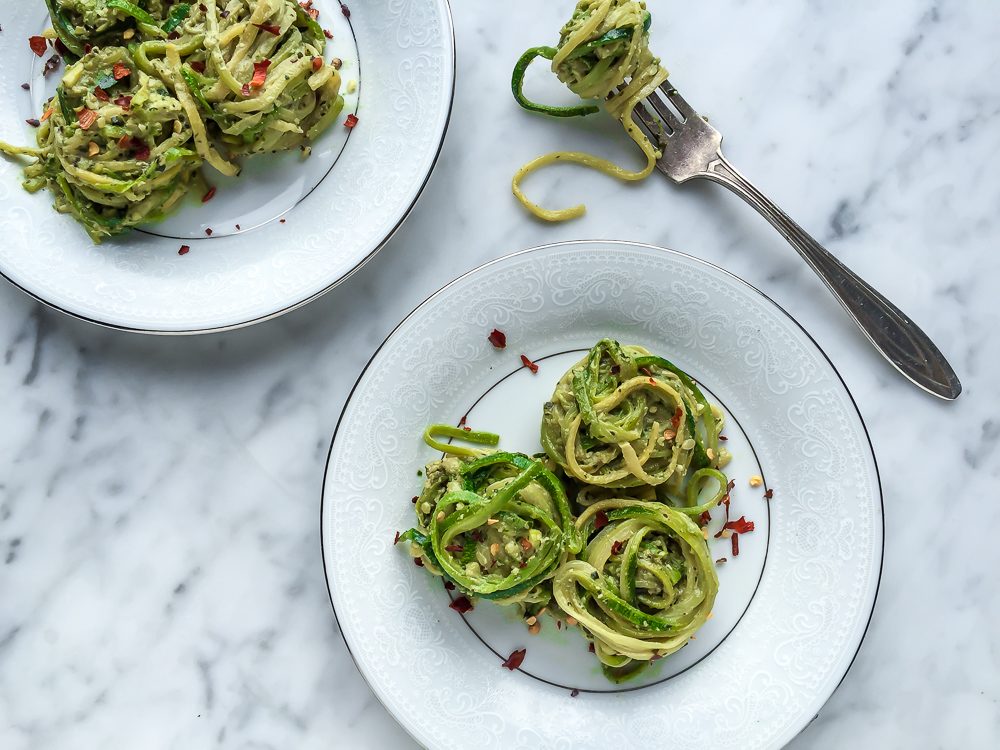 Turn the heat off, and toss with your sauce of choice while the noodles are still in the pan, so the sauce really clings to the noodles. Some sauce / vegetable noodle combos I love are: zucchini noodles with pesto (I particularly love my vegan Cilantro Pistachio Pesto; it’s wonderfully creamy and is a brilliant, beautiful green), sweet potato with Thai peanut sauce, yellow squash with Alfredo. You can also toss sweet potatoes or potatoes with corn starch and some salt, and put them in the oven at 400 degrees until they turn golden brown and then – voila! You have homemade curly fries!