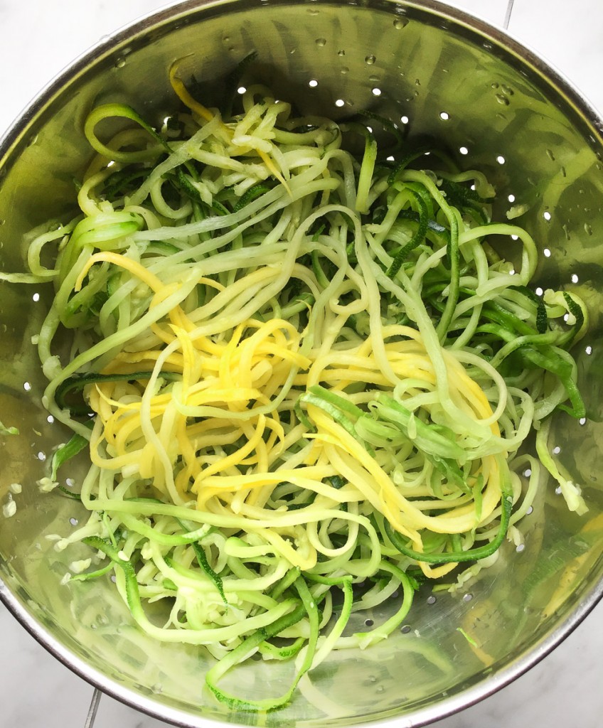 When you have your noodles, stick them in a bowl or colander and sprinkle them with fine grain salt. Toss until they’re coated and then put them aside for 30 minutes to 1 hour. The salt draws the liquid out of the vegetables, and getting the liquid out is how you’ll achieve that lovely, noodle type texture (or awesome crispy curly fries), and avoid a soggy, clumpy mess.