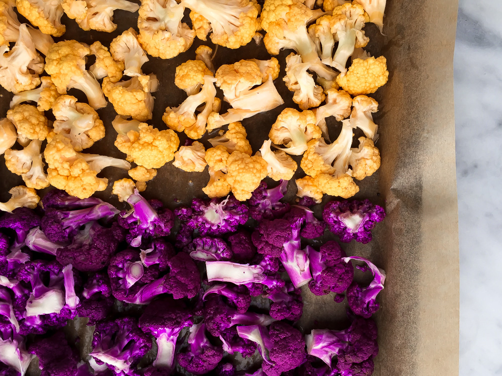 The purple and orange cauliflower that I used contain additional antioxidants that give them their rich pigment, but the more typical white cauliflower will work wonderfully in this recipe, and is a health superstar on its own. Beyond taking on an amazing caramel crunch when roasted, cauliflower is rich in health benefits. It’s an excellent source of vitamin C, vitamin K, folate, pantothenic acid, and vitamin B6. The vitamin K, in combination with cauliflower’s sulfuric compounds, work to stop body inflammation at the source, while the vitamin C keeps the immune system in tip-top condition.