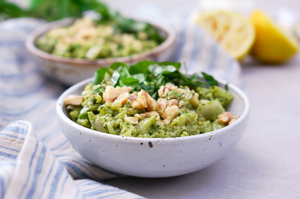 Now I’m going to say something that may be sacrilegious, so classicists, avert your eyes: I’m not a huge fan of the pine nut pesto base. First, pine nuts are insanely expensive, and grinding them into a garlic and herb pulp makes me physically wince. They offer little in the way of texture and their flavor, in my opinion, is too delicate to stand up to the other strong ones in the pesto. I much prefer using walnuts in my pestos. They offer a rich, nutty flavor that perfectly compliments the herbs and garlic, and have such a substantial, hearty and creamy texture that you can get away with not using any cheeses (which is both great for vegans and lets the herby flavor shine through).
