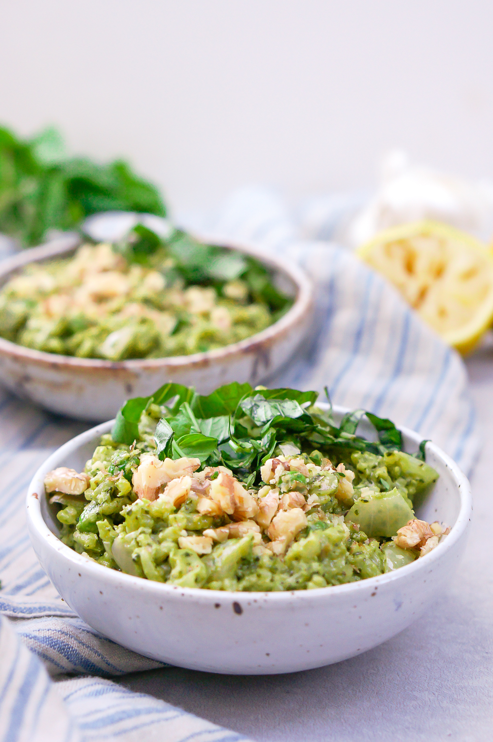 This, to me, is a perfect January recipe. There are two things I want in January, and they often feel like they’re at odds: to give my body a break from the bread and potato and cookie and alcohol pummeling of December, and to eat food that feels warm and comforting, like a down jacket for my insides. This mixed herb and walnut pesto risotto most certainly fits the bill.
