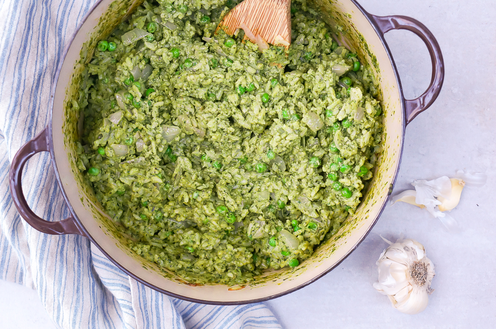 - Preheat oven to 350 degrees. In a medium-large pot, bring vegetable stock and white wine to a simmer over medium-high heat. Meanwhile, in a large, oven safe pot with a lid (the lid also needs to be oven safe, although you can also cover tightly with foil in a pinch), melt high heat oil over medium-high. Add onion and cook until translucent, about 3 – 4 minutes, stirring occasionally. Add rice and cook for 2 additional minutes, stirring occasionally. By now, your stock/wine mixture should be simmering – add the simmering liquid to the rice, give it a quick stir and put the lid on, and place the whole pot in the oven. Bake for 30 minutes, or until all liquid is absorbed (if it hasn’t when you check at 30 minutes, do 5 min increments). No need to stir while baking. While risotto is baking, make the pesto sauce.