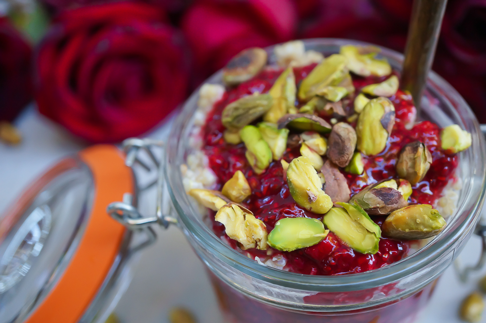 - In a small saucepan, cook frozen raspberries over low heat for 10 – 15 minutes, or separating, squishing and stirring them with your spoon as they defrost and release their juices. Remove from heat and stir in lemon, vanilla, rose, sweetener and sea salt; stir well. Sprinkle chia seeds over mixture, then stir until they’re mixed well. Let sit for 15 – 20 minutes, or until a gel, jam-like consistency forms. Stir once before serving! Makes 2 servings, and can be stored in the fridge for 4 – 5 days.