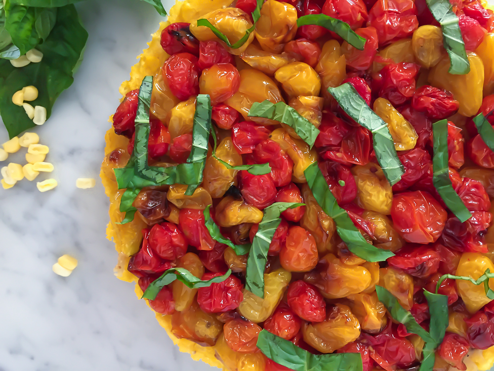 The basil was a no-brainer, adding that element of freshness to lighten the heartiness we’re going for. I’d long wanted to experiment with a gluten-free, polenta based tart, and when I spotted some gorgeous fresh corn at one of my favorite farmer’s market stalls, the idea solidified: a beautiful tart made of polenta studded throughout with sugary, juicy bits of summer corn, topped with a savory sweet layer of roasted garlic, decadently umami cherry tomatoes, roasted until they caramelize and their juices begin to ooze out, topped with garden fresh basil.