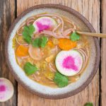 Miso is a fermented soybean paste. Beyond being packed with probiotics, it’s rich in glutamates, the compound that creates that “umami” flavor things like bacon and parmesan are known for. It’s adds an incredibly richness and depth to this soup, making it absolutely addictive. Like the kimchi juice, the recipe calls for the miso at the absolute end, to keep all of the probiotics intact.